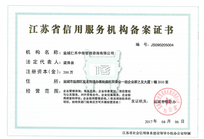 • 江蘇省信用服務機構備案證書